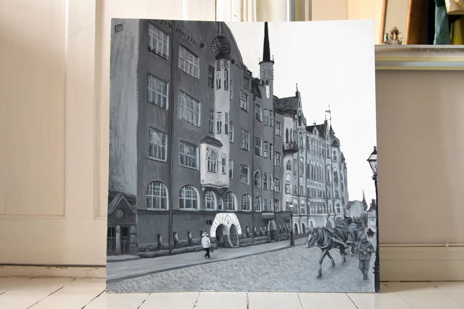 Tässä kapalevylle tehty maalaus, jonka toteutin täysikokoisena Pietarinkatu 9 sähkökaappiin. Tein tällaisen teoksen ensin jotta voisin esitellä ennen varsinasta maalausurakkaa miltä valmis maalaus näyttää sähkökaapissa.