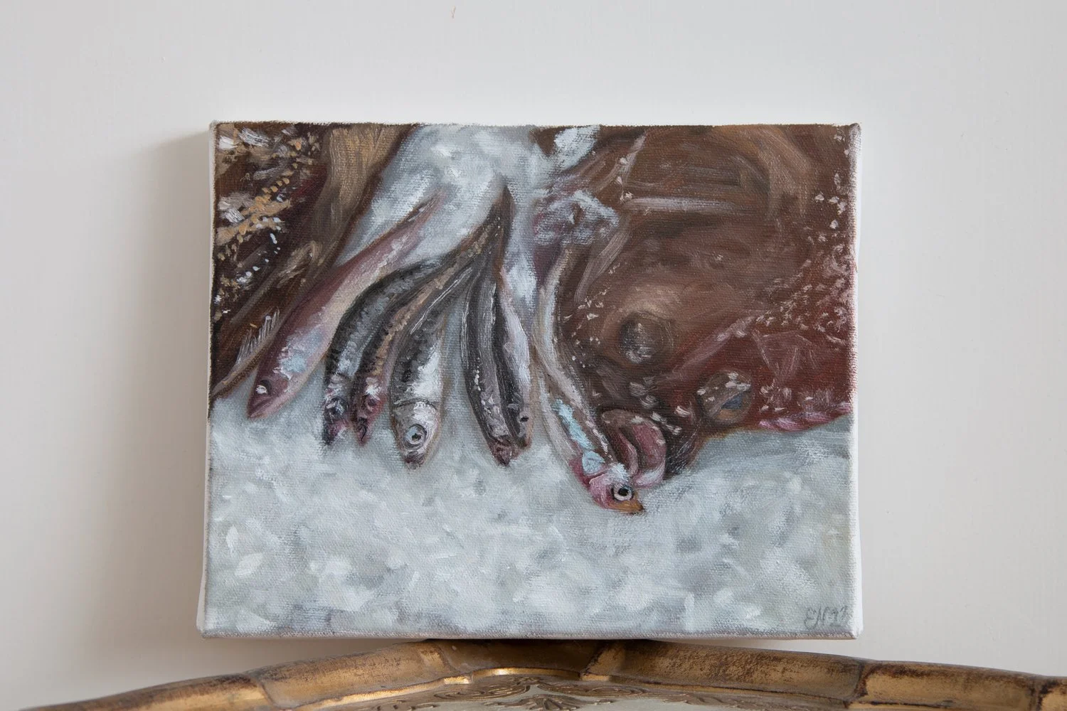 Terveiset kalatiskiltä IV / 25x20cm / oil on canvas / 2023